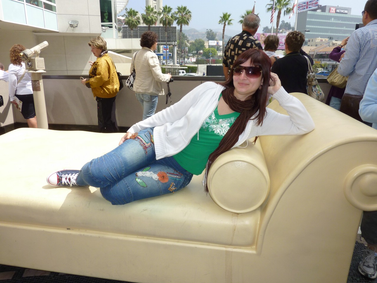 Со второго этажа здания киноакадемии мы смогли увидеть вдалеке на Голливудских холмах знаменитую надпись HOLLYWOOD. Хоть и не близко, но на приближении видно хорошо – ведь каждая буква более 13 метров в высоту. Двор здания был выполнен в виде композиции «Как попасть в Голливуд». Шли дорожки в разные стороны, каждая из которых заканчивалась на потенциальном способе. Естественно, самый популярный способ – большая Голливудская кровать. Я не успел моргнуть, как Оля уже лежит на ней и ждёт. Правда, продюсер так и не пришёл, но зато оператор был на месте.