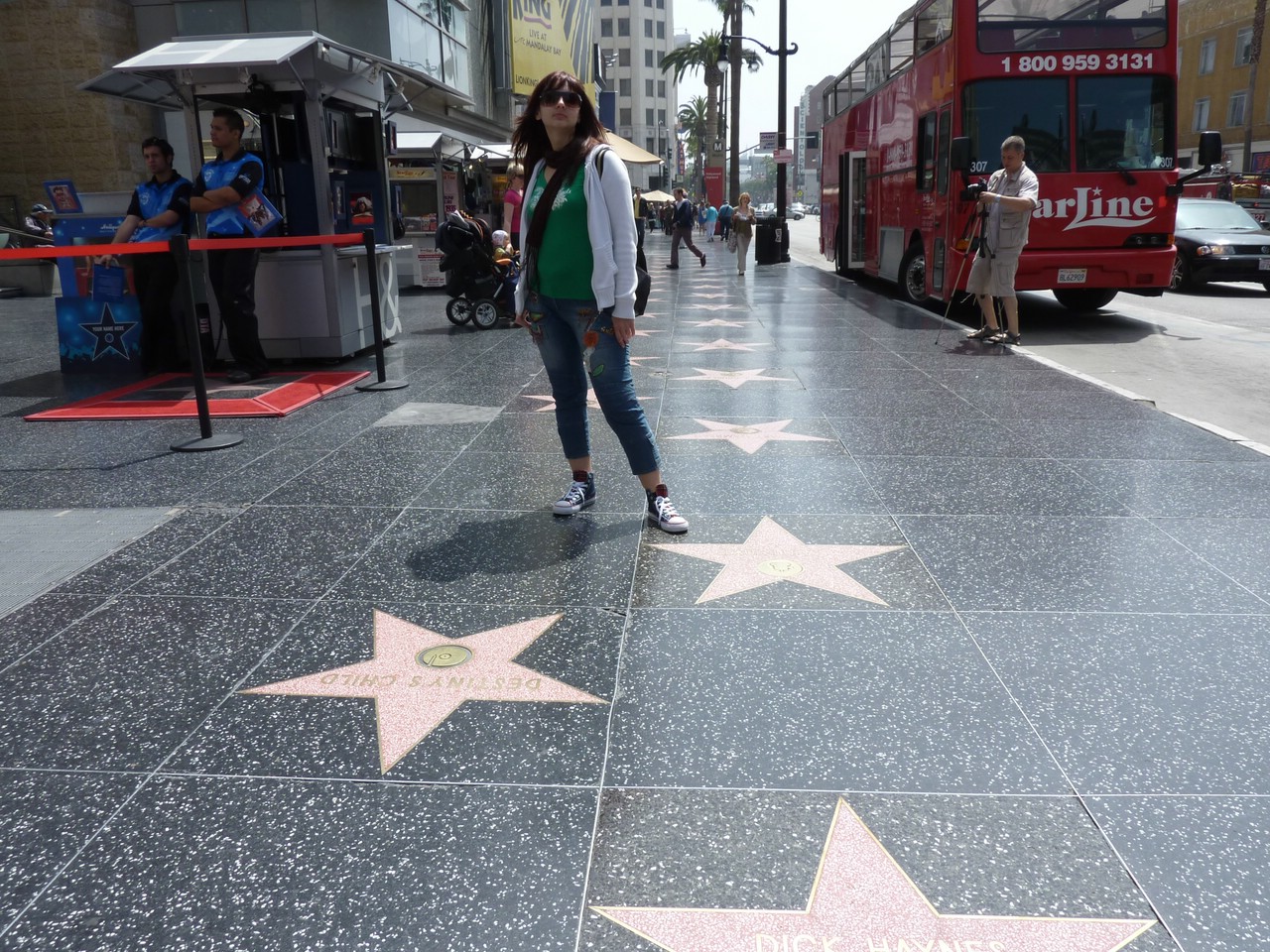Шикарные дома в Беверли-Хиллз мы видели. А где же можно на такой заработать? За ответом мы едем не иначе как в Голливуд – сердце американской киноиндустрии. При одном слове «Голливуд», у многих расширяются зрачки и учащается сердцебиение. Могу их успокоить, что тот самый знаменитый Голливуд на самом деле представляет собой ничем особо не запоминающийся район Лос-Анджелеса, за исключением киностудий, надписи на холме, центра награждения американской киноакадемии и Аллеи звёзд. Это то, что интересует туристов. У нас была остановка на Голливудском бульваре. Мы зашли в здание академии киноискусств, где вручают премии Оскар, поднявшись по той самой лестнице, по которой идут все знаменитости. К сожалению, знаменитостей мы не встретили, если не считать их двойников, позирующих на улице для фотографий. Вспоминаю один эпизод из детства: в 90-х годах было особенно модно пародировать Майкла Джексона, и по телевидению выступали такие «артисты». Один был совсем не похож, и на вопрос папе «двойник ли это?», я услышал блестящий ответ: «Двойник? – это тройник!» Честно говоря, мне показалось немного кощунственным, что развлекает публику Джексон. Ладно, Мерилин Монро рядом с ним, так её уже 50 лет как нет, а его полгода всего лишь. Тем не менее, вокруг обоих толпа, фотографируются все, кому не лень... заплатить за это несколько долларов.