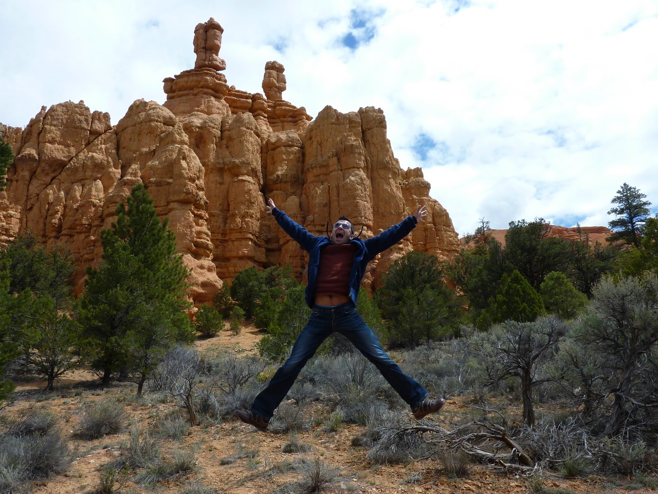 После посещения Гранд-Каньона я думал, что меня уже больше ничего не удивит. Но потом мы приехали в Брайс-Каньон (штат Юта). Нам рассказывали, что Брайс примечателен своими уникальными геологическими структурами, образованными эрозией речных и озерных осадочных пород, под действием ветра, воды и льда. Говорили, что из-за более высокого расположения, чем предыдущий каньон, мы увидем некий геологический контраст. И мы увидели! Наши физиономии, смотрящие на ЭТО не поддавались никакому описанию. Это просто чума, это другая планета, это фантастическое чудо природы! Яркие скалы и колонны причудливой формы, что-то совершенно необычное и потрясающе красивое. Можно было спуститься по тропинке к основанию – сделали это, даже не задумываясь о тяжёлом подъёме назад. Несмотря на май месяц и довольно тёплую погоду, местами ещё попадаются кучки не растаявшего снега. Брайс-каньон, безусловно, покорил нас своей красотой.