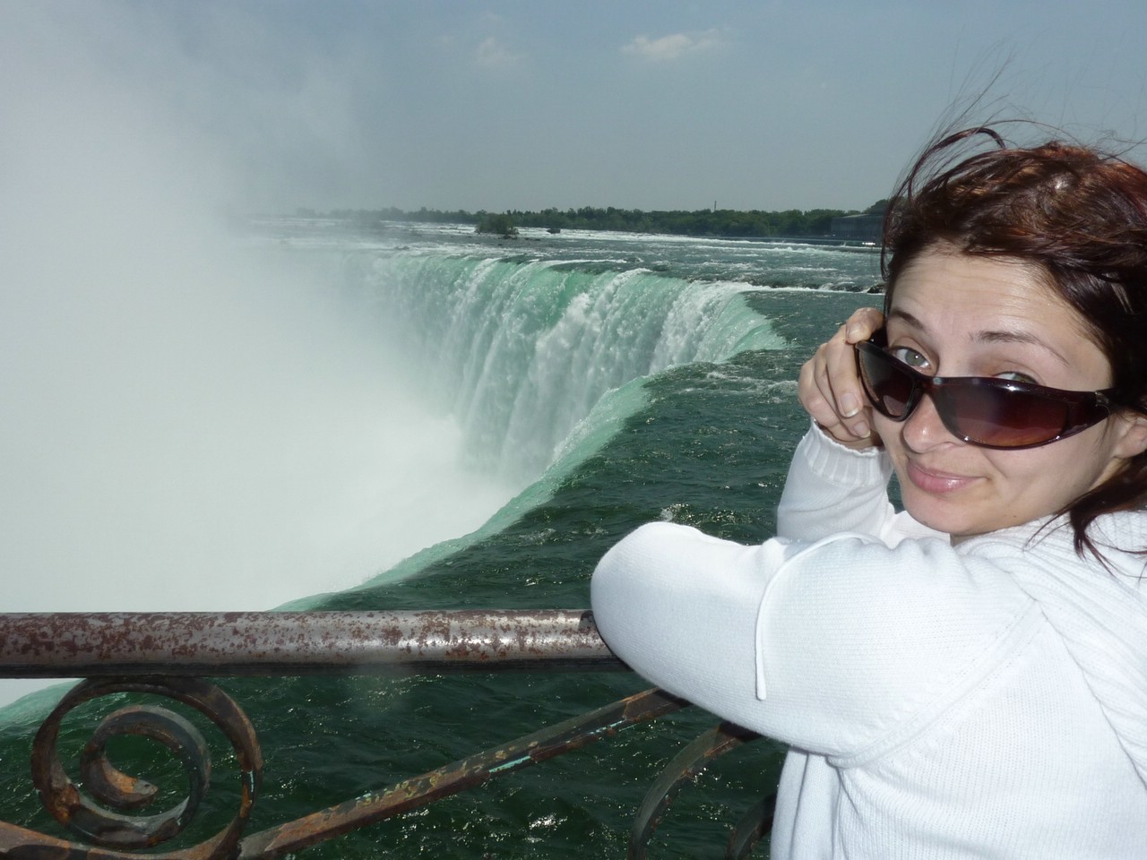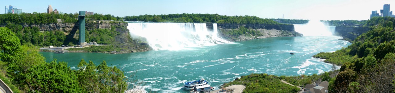 Так как Ниагарский водопад находится на пути из Торонто в Нью-Йорк, мы не могли тут не выйти. Тем более, нас тут ждала уже месяц назад заказанная гостиница. Давайте немного разберёмся, что такое Niagara Falls. Канадскую провинцию Онтарио и американский штат Нью-Йорк разделяет река Ниагара. Там, где на её пути были более мягкие породы известняка, река образовала несколько водопадов: Канадский водопад («подкова») на территории Канады, Американский водопад на противоположном берегу, и находящийся рядом с ним водопад «Фата». Высотой водопады всего 53 метра, но они очень широкие и потрясающе красивые. Это привлекает туристов и способствует процветанию городов на его берегах. И канадский и американский города называются Niagara Falls. Наиболее красочный вид на водопад открывается с канадской стороны, но и американцы не отчаялись и построили специальный выступ, свисающий над пропастью. Без него они не увидели бы собственного водопада, да и «подкова» видна оттуда лучше.
