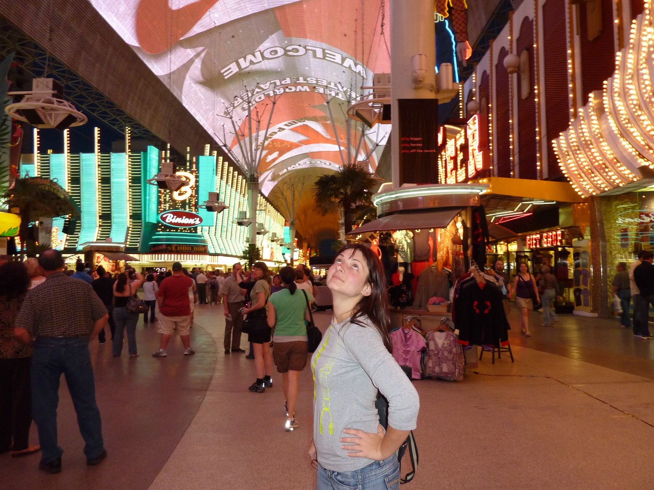 На Фримонт-стрит погуляли по F.S.E – крытой куполом улице с магазинами и казино. Интересно, что каждый час на потолке (а это почти 30 м. высоты и 500 м. длины) показывают  шоу – видео-фильм. Таких больших экранов мы до этого ещё не видели.