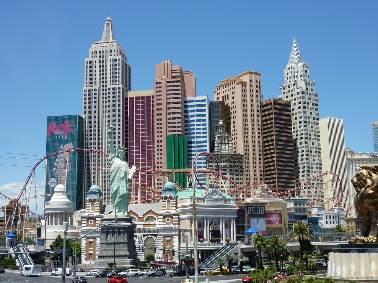 Зашли в гостиницу «New-York – New-York» - самое настоящее воплощение Нью-Йорка в Вегасе. Гостиница состоит из комплекса зданий в виде панорамы Манхэттена. Внутри холлы отделаны под целые улицы с домами, магазинами и кафе. Тут тебе и Бродвей, и Таймс, и даже американская горка, идущая через всю
