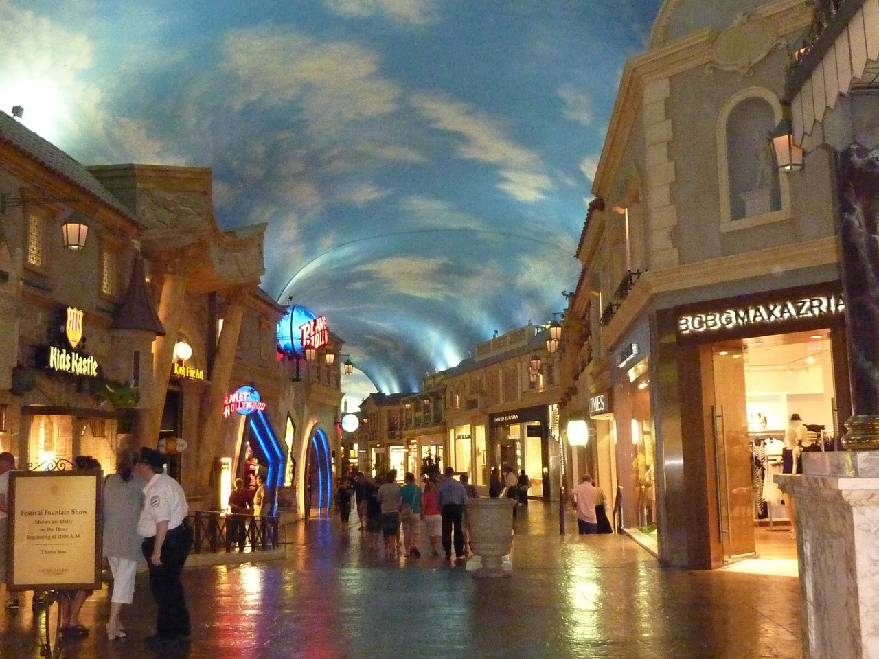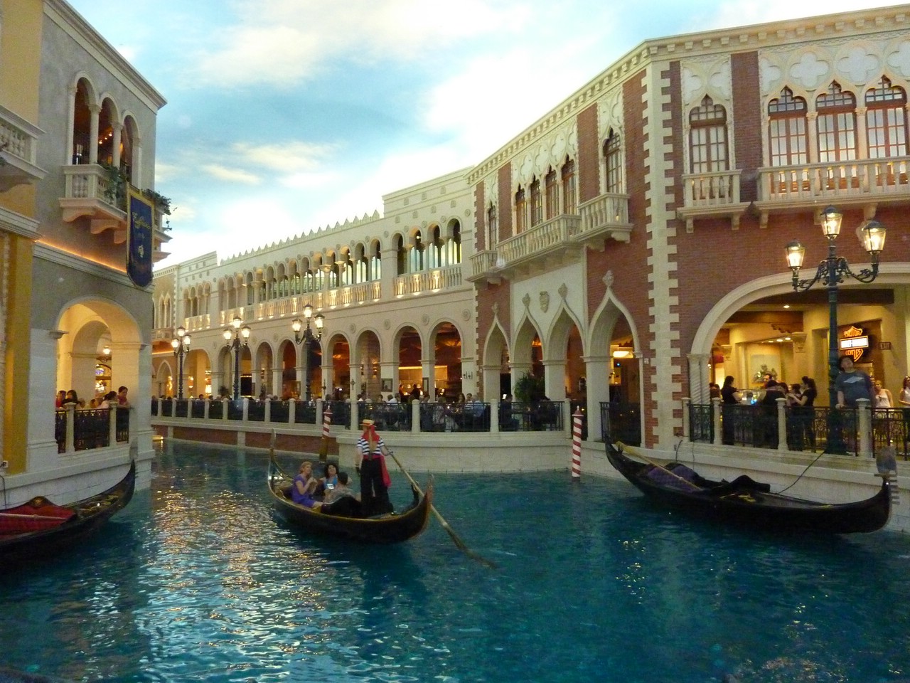 одном мы даже заблудились и не сразу смогли выйти. Также каждая такая гостиница предлагает своё шоу. Это может быть театральное или цирковое представление, мюзикл или варьете, вечер юмора или концерт. Организаторы тура нам заранее предложили один из вариантов шоу, на которое можно при желании пойти. Когда стало понятно, что 2 билета на хорошее шоу стоят в районе 300$, мы решили подождать до вечера, поискать что-то более доступное. Так как гостиницы все огромные, хождение по ним заняло довольно много времени. Уже было часа 4 дня. По плану нам оставалось посетить ещё одну гостиницу «The Venetian», после чего вечер был свободен. Этот роскошный отель «Венецианец» знаменит не только интерьерами, повторяющими романтические улочки Венеции, но и тем, что по каналам плавают настоящие гондолы. Гондольеры даже поют для своих пассажиров.