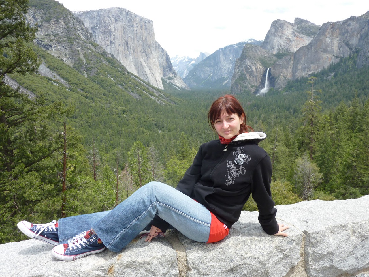 невесты), хорошо видимый с недалеко проходящей тропы. Вы можете себе представить водопад высотой 739 метров? Даже великий Ниагарский водопад всего 53 метра высотой - это в 14 раз меньше. Зрелище, конечно, божественное. Для Оли, любительницы горного туризма, здесь тоже было на что посмотреть. Ведь прямо тут находится один из наиболее популярных в мире объектов среди скалолазов с маршрутами разного уровня сложности - огромная скала из чистого гранита Эль-Капитан, высотой 2307 м. Кто-то из нашей группы даже увидел там скалолазов.