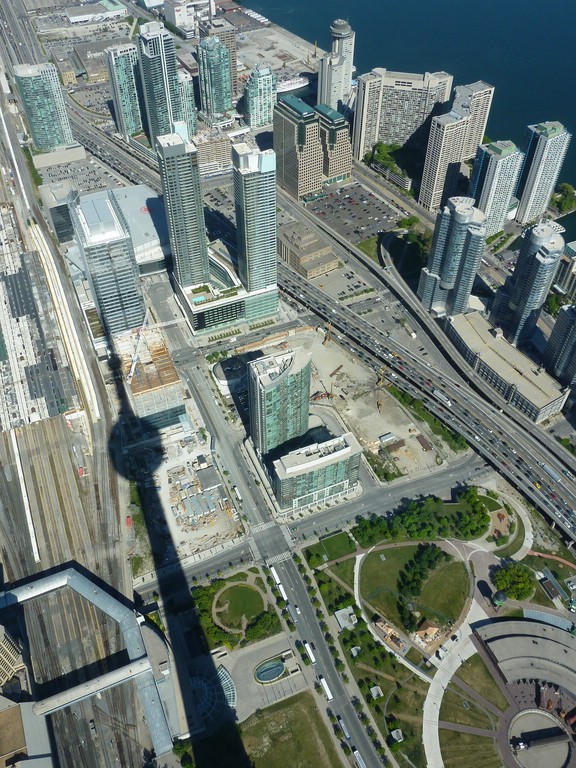 Следующий день мы провели с друзьями, много гуляли и поднялись на знаменитую башню CN-Tower. Более 30 лет она была самым высоким сооружением на планете, пока её не обогнала Дубайская башня. Высота CN-Tower составляет 553 метра, это почти в 2 раза выше Эйфелевой Башни. Сначала мы поднялись на 350 м. Это уже выше, чем Empire State в Нью-Йорке. На этом уровне находится вращающийся ресторан и прозрачный пол. Насладившись видом, поднимаемся ещё на 100 метров выше. С высоты 450 метров стоящие рядом небоскрёбы (см. фото) уже виднеются где-то далеко внизу, а открывающаяся панорама просто захватывает дух. Выше подняться я уже вряд ли смогу, так как в Дубаи проезд мне закрыт.